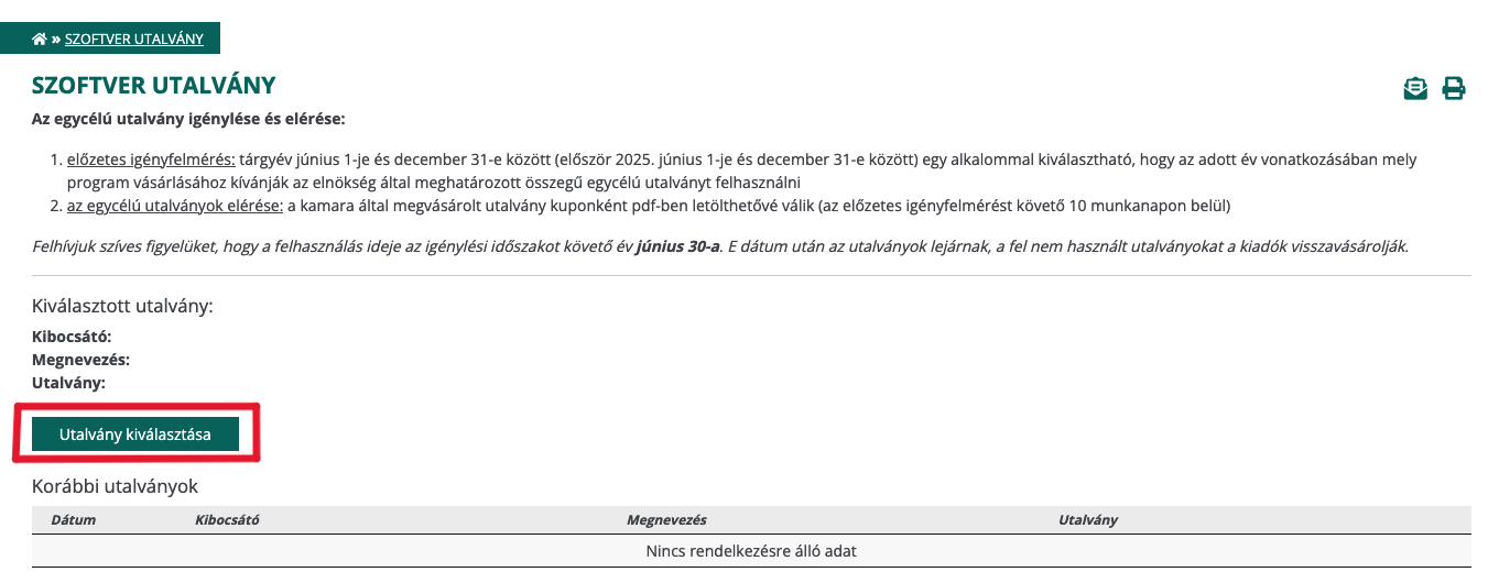 Az aktív tagsági jogállású kamarai tagok minden év vonatkozásában egy darab, a választásuk szerinti utalványt/generált utalványkupont tölthetnek le a kamarai honlap „saját adatok” menü pontjából, amit az azt kibocsátó kiadó szoftverének, tehát a választásuk szerinti szoftvernek a megvásárlásához használhatnak fel.