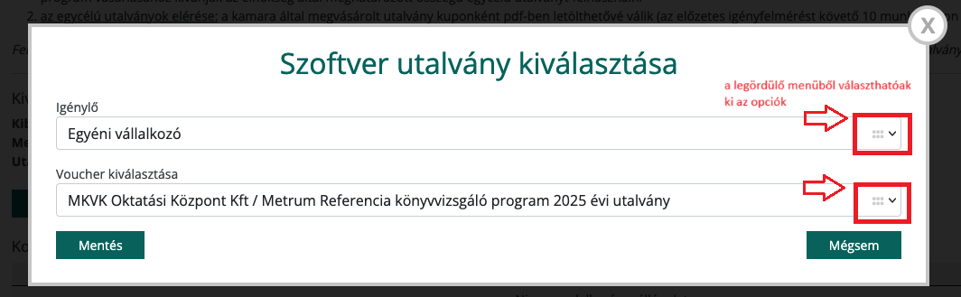 Az aktív tagsági jogállású kamarai tagok Ügyfélkapu+ vagy DÁP bejelentkezést követően a kamarai honlap „saját adatok” menüpontjában a szoftver utalványra kattintva tárgyév június 1-je és december 31-e között (*2025-re vonatkozóan 2026.február 28-ig) egy alkalommal kiválaszthatják, hogy az adott év vonatkozásában mely program vásárlásához kívánják az elnökség által meghatározott összegű egycélú utalványt felhasználni. Felhívjuk szíves figyelmüket arra, hogy egyelőre a MKVK Oktatási Központ Kft. Metrum Referencia és a Dimenzió Kft. DigitAudit könyvvizsgáló programoknak megvásárlására választható ki az egycélú utalvány.